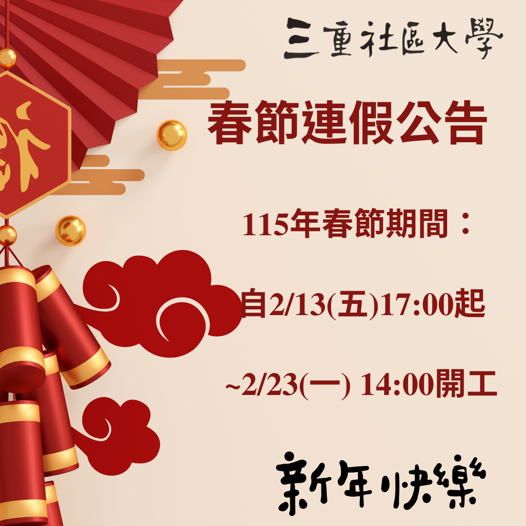 春節期間自2/13(五)下午5點起至2/23(一)下午2點開工