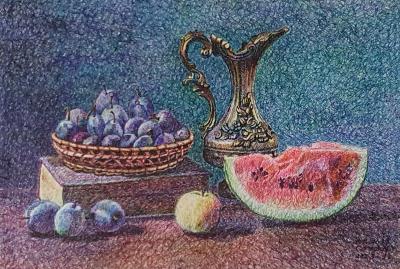 | 2 | 單個水果:力道的控制與深淺變化,基本筆觸、特殊筆觸練習單個物體塊狀關係及轉換成光線色調練習(老師先示範) | 單色,漸層、重疊的色調練習 |
